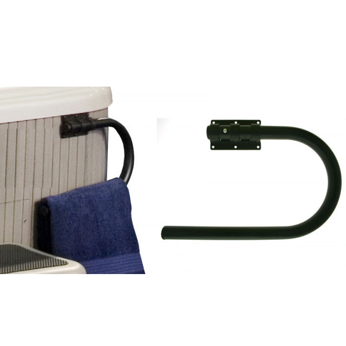 The TowelBar is one of those deceptively simple ideas that makes all the difference. Holds towels just a short distance away from splashing water and steam. When not in use, it folds flat against the spa.