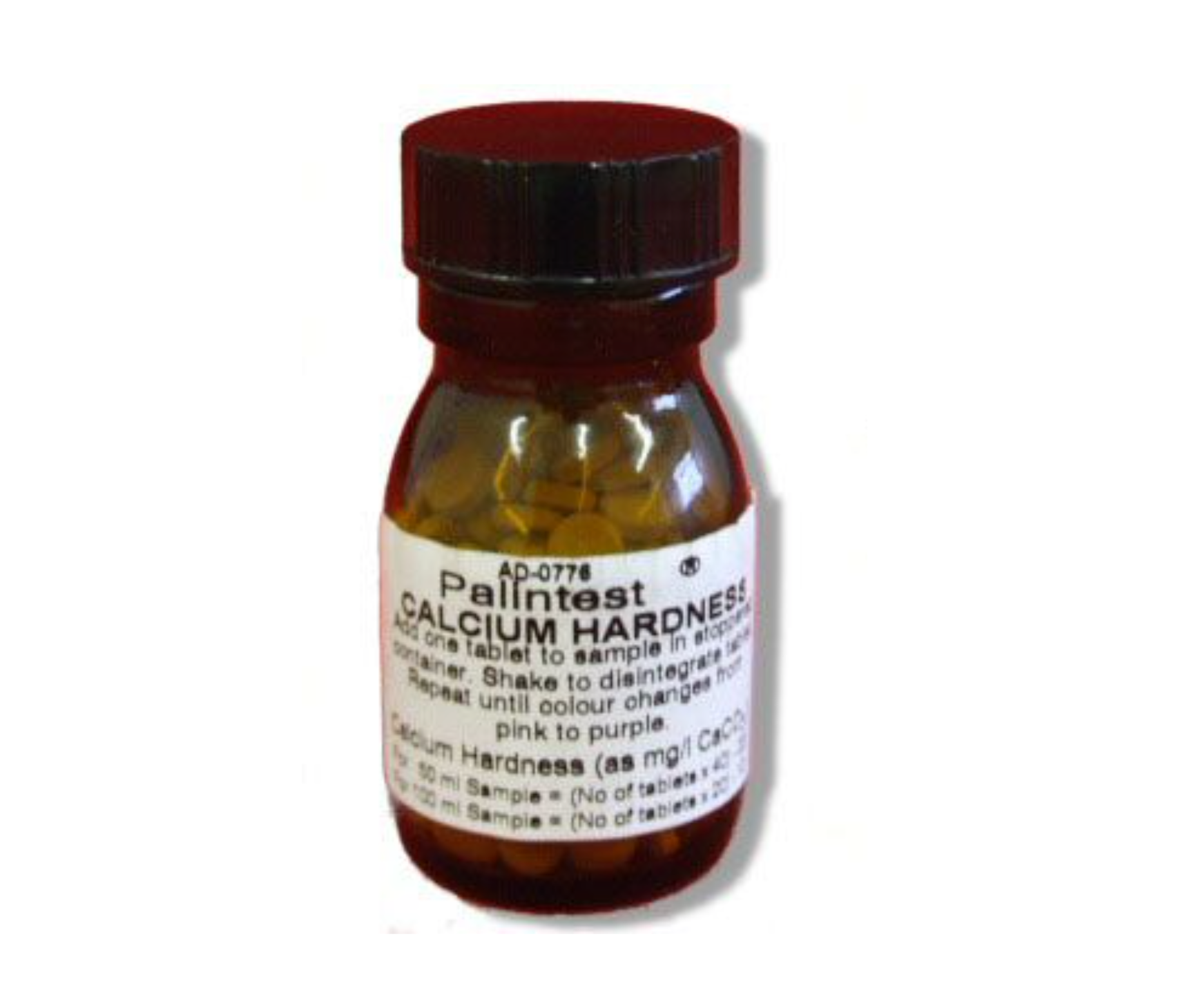 These tablets are added one-by-one to a 100ml sample of pool water. The water will then turn from pink to bright purple. The calcium hardness level is then determined by the following formula Calcium Hardness Level (ppm) = (number of tablets it takes to turn bright purple x 20) - 10